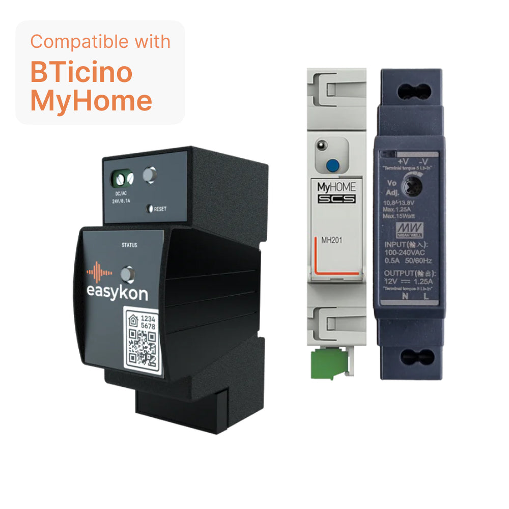Easykon for MyHome + Gateway MH201 + Alimentatore 12 V | Dispositivo da barra DIN, bridge con connessione Ethernet per il controllo smart dell'impianto domotico BTicino MyHome SCS.