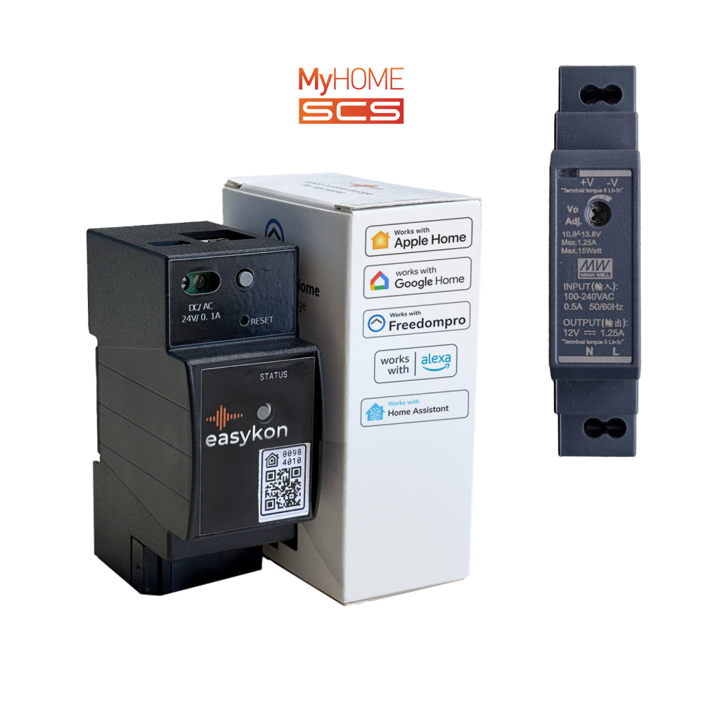 Easykon for MyHome + Alimentatore 12 V | Dispositivo da barra DIN, bridge con connessione Ethernet per il controllo smart dell'impianto domotico BTicino MyHome SCS.
